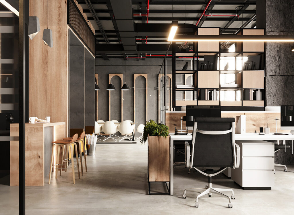 Industrial design for banks combines bold aesthetics with practicality. Exposed materials, metal accents, and durable finishes create an environment that is both striking and operationally robust, emphasizing strength, security, and modern professionalism.